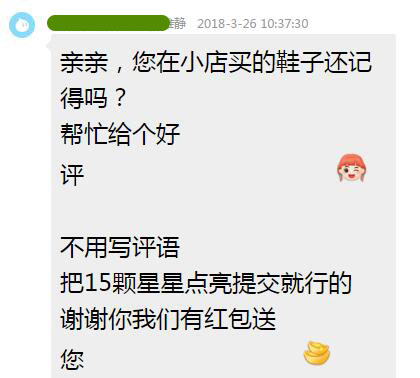 現(xiàn)在的某些個(gè)別淘寶商家,滿滿的都是套路!正在不斷的侵蝕著淘寶的信譽(yù)。 本人前幾天在淘寶買(mǎi)了雙涼鞋,收貨后,還沒(méi)有給評(píng)價(jià),想穿幾天看看再評(píng)價(jià)。 今天店家客服找我,說(shuō)是好評(píng)了有紅包,信息如下: