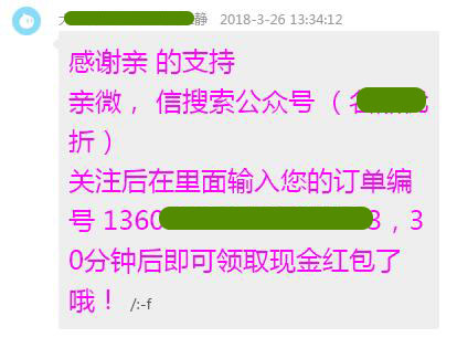 大家看到了嗎,紅包暫時(shí)是拿不到的,還要按著他們的要求,繼續(xù)做, 1、要關(guān)注他們的微信公眾號(hào) 2、要輸入訂單號(hào) 3、30分鐘后才能拿到現(xiàn)金紅包 至此,我已經(jīng)感覺(jué)到是套路了,騙子的套路都是這樣的,一步一步的牽著鼻子走。 我已經(jīng)決定不要這個(gè)紅包了,因?yàn)槲也恢篮竺孢要我做什么, 而且,這個(gè)紅包也不大,估計(jì)是1塊或者2塊錢(qián)的小紅包,還要做這么多,得不償失。 在此,也勸大家以后要注意了。 |