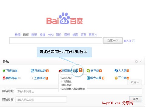 這種類似網(wǎng)絡書簽的導航功能,百度搜藏已經(jīng)可以實現(xiàn),這次百度在其首頁增加這種自定義網(wǎng)址功能,可能想讓百度能成為更多人的個人首頁,讓那些不屑于使用hao123的用戶能夠在IE瀏覽器下方便訪問自己常用的網(wǎng)站,對于Chrome和Firefox瀏覽器用戶來說,其已經(jīng)實現(xiàn)了自動同步,新建標簽頁會自動顯示常用的網(wǎng)站,百度的這個新功能可能更多針對IE用戶設計。它的作用是訪問其他網(wǎng)站的便捷入口,系統(tǒng)將自動推薦你常訪問的網(wǎng)站,你還可以主動添加自己喜歡的網(wǎng)站,綁定網(wǎng)站后可接收通知消息。