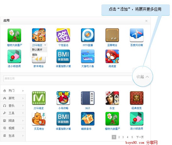 為我們推出眾多的應用,你可以將你喜歡的應用,添加到首頁,每次登錄百度就可以直接使用這些應用。比如植物大戰(zhàn)僵尸,斗地主,百度風云,更多的應用,為我們生活服務。