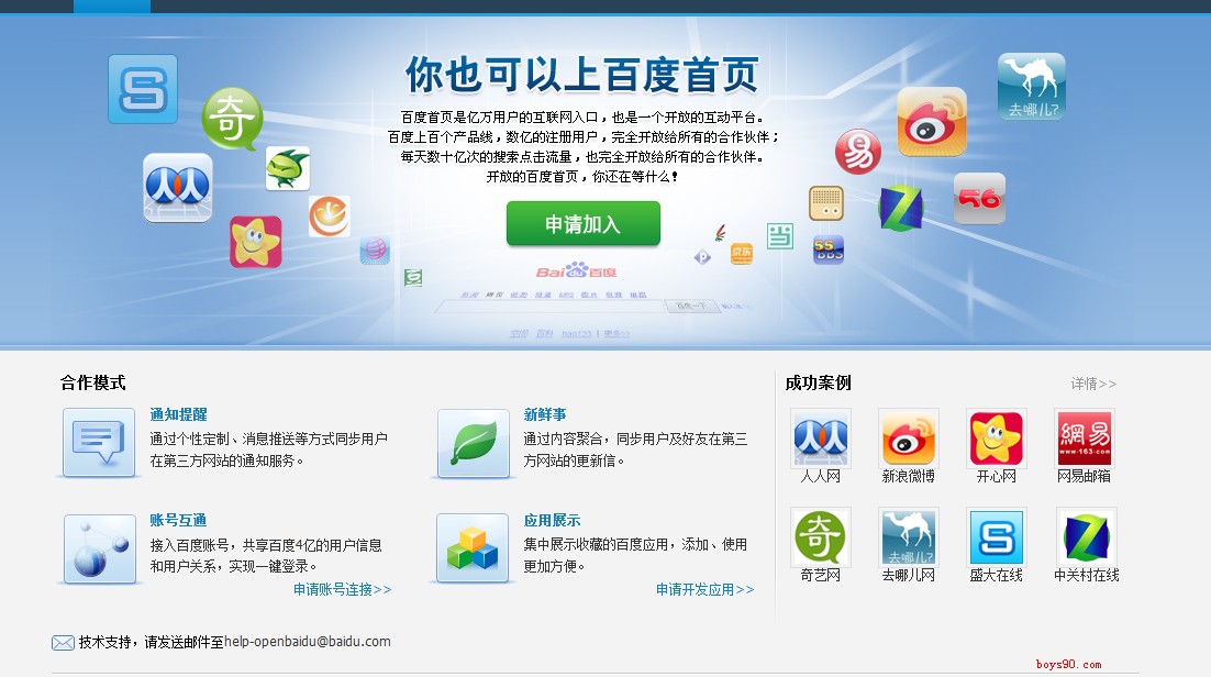 首頁,百度首頁是億萬用戶的互聯(lián)網(wǎng)入口,也是一個開發(fā)的互聯(lián)網(wǎng)平臺。這次百度上百個產(chǎn)品線,數(shù)億的注冊用戶,完全開放給你所以合作伙伴,每天數(shù)十億的收縮點擊流量,也完全開放給合作伙伴。這一點是個人覺得百度做的最好的。