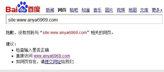 我正在優(yōu)化的一個(gè)網(wǎng)站,優(yōu)化詞:廣告扇、廣告扇子、廣告扇廠,網(wǎng)址:www.anya6969.com,排名一下在第一頁(yè)。今天早上,客戶(hù)給我打電話說(shuō),網(wǎng)站在百度里找不到了。我趕緊上百度搜索查詢(xún):