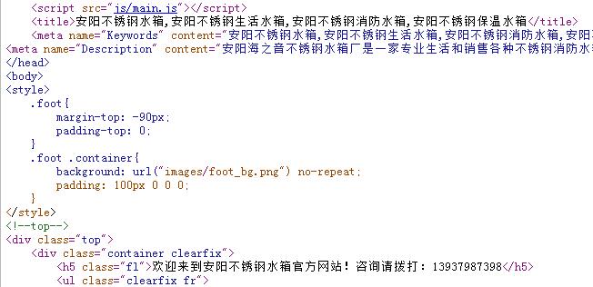 上面圖片顯示的是我的網(wǎng)站的百度快照信息,大標題是“歡迎來到安陽不銹鋼水箱官方網(wǎng)站!咨詢請撥打:.....” 而我的網(wǎng)站代碼中title標簽中的內(nèi)容是: