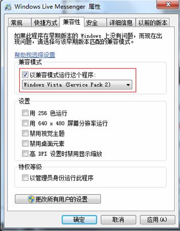 打開“開始”,“程序”,找到“Windows live”下面的“Winodws Live Messenger”,右擊此程序選擇屬性--兼容性?D將“以兼容模式運(yùn)行這個(gè)程序”勾上,在下拉菜單中選擇Windows Vista(Service Pack 2)即可,之后重啟解決。