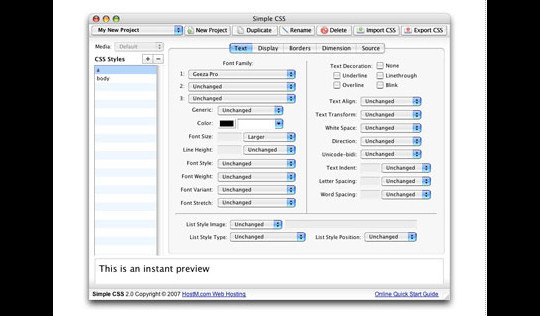 Simple CSS 幫助你非常容易的創(chuàng)建層疊樣式表。 Firdamatic: the Design Tool for the Uninspired Webloggers