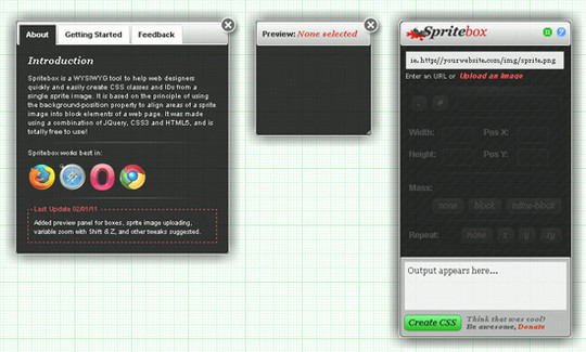 Spritebox 是一款所見即所得的工具,幫助設計師從一張 sprite image 生成CSS Classes 和 CSS IDs。