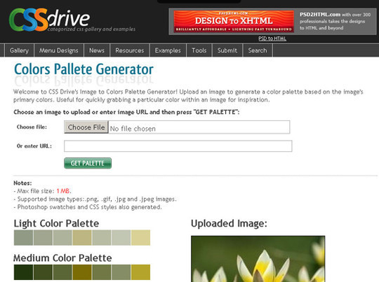 Colors Pallete Generator是一個在線查看圖片配色的服務。colors pallete generator 只需要上傳圖片,或者輸入圖片的網絡地址,其便可以分析出此圖片應用的配色方案。 CSS Menu Generator by Webmaster Toolkit